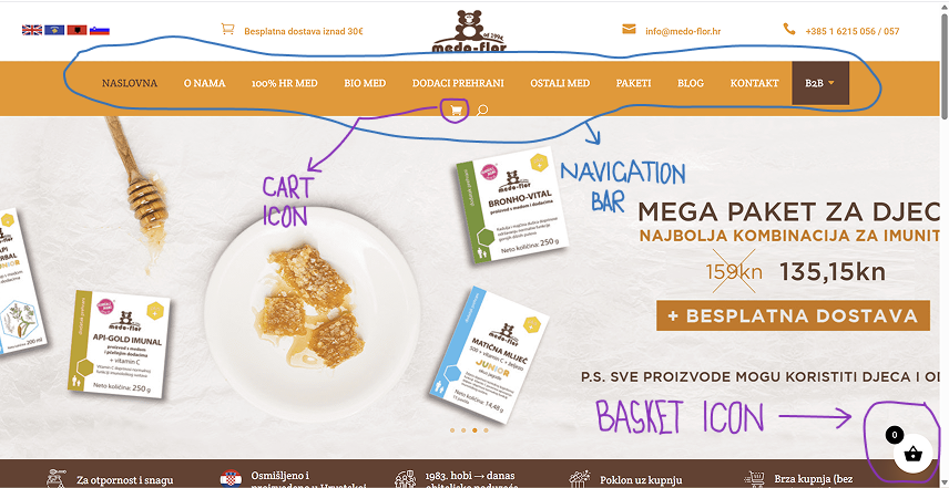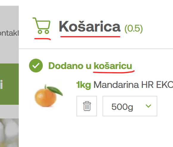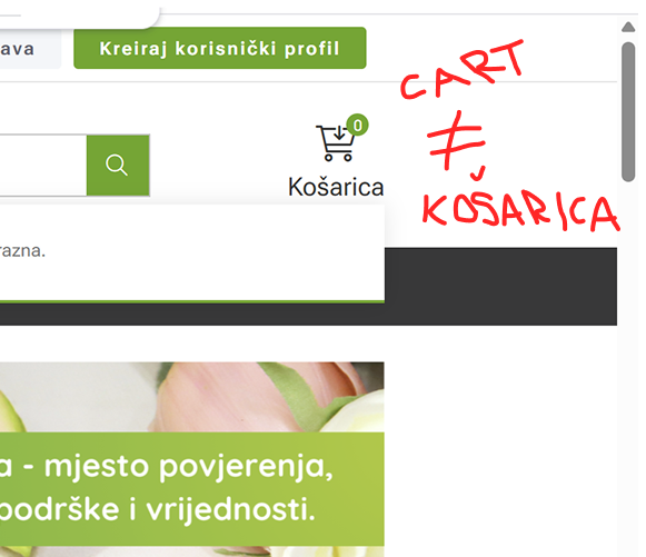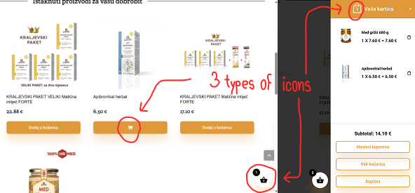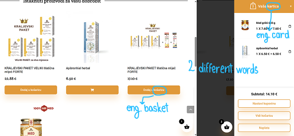 This next example shows a webshop using 3 different icons: a basket at the bottom, a bag in a mini bag window, and a cart that shows up when you hover over CTA. Moreover, it uses the 2 different Croatian words “košarica” meaning “basket” on the CTA and “kartica” meaning “card” as the name of the mini cart/bag/basket. So, are your items in the basket or cart, or bag? Or are they in the “card”?