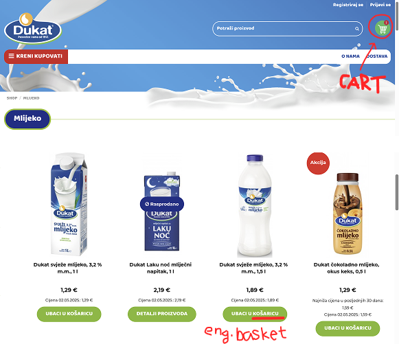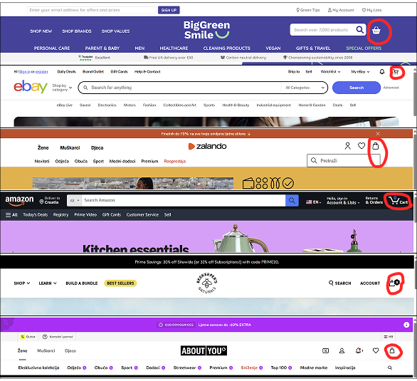 Webshops that didn’t match the icon’s appearance and name were often non-English sites from countries like Germany, Croatia, etc. Croatian sites usually use the shopping cart icon, and sometimes the bag or the basket icon, but the word they use when referring to an icon or its page is always, without exception – a basket (Croatian “košarica”). Their CTAs have an “add to basket” label, the title for the cart page is “your basket,” and so on.