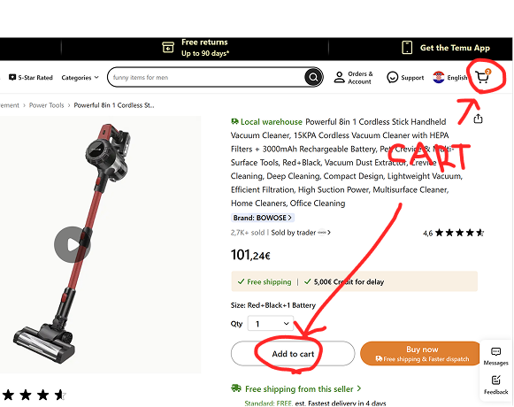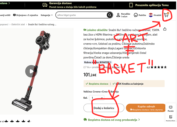 Also, when changing a site from the English version (e.g., Temu) with the “add to cart” button to the Croatian one, it would change to the “add to basket” button.