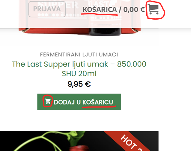 However, the most used icon was the cart icon combined with an “add to bag” or “add to basket” CTA. You can see this in the image below with the Croatian word “košarica” for basket.