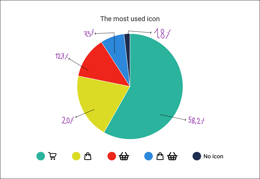 There were 60% of cases whose icon matched the word on their CTA, meaning if a webstore used a cart icon, their CTA said: “add to cart”. This leaves us with 40% of examples that used one type of icon and another word for it on the CTA or page.